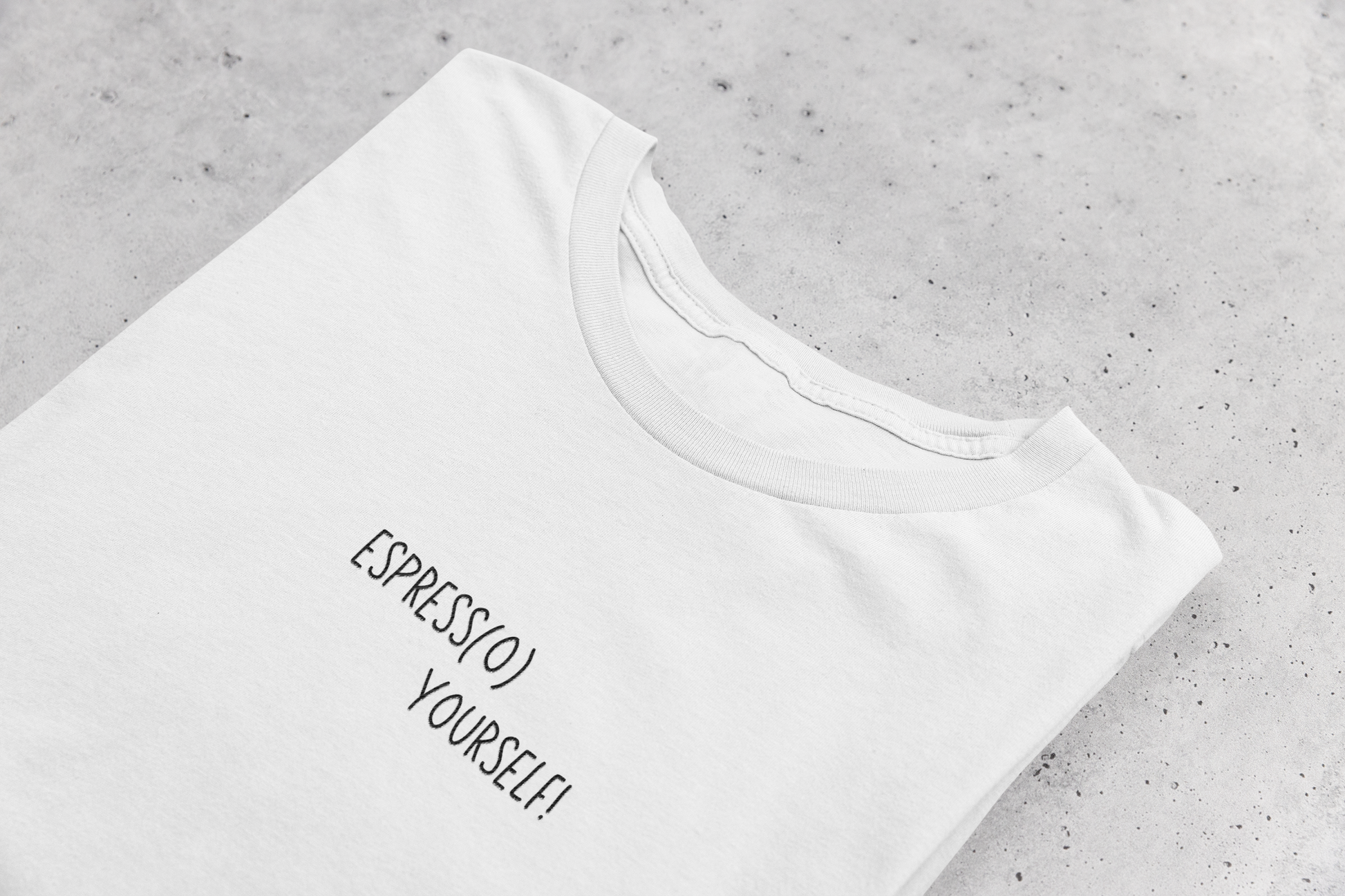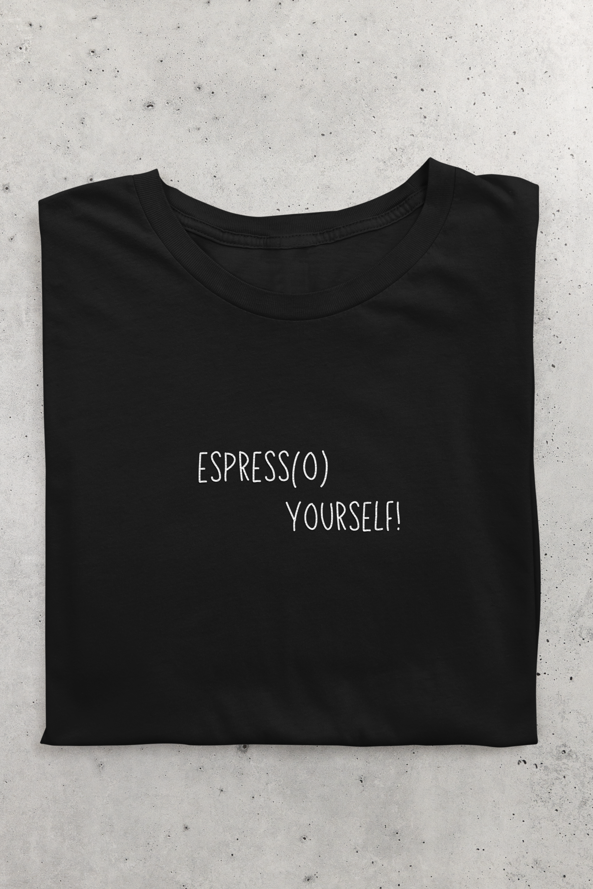 Ein Augenzwinkern in Typografie: Mit dem Wortspiel „espress(o) yourself!“ wird aus dem Espresso eine Einladung zur Selbstentfaltung. Dieses Shirt ist modern, kreativ und inspiriert dazu, jeden Tag mit Charakter, Stil und einer guten Portion Koffein zu beginnen.